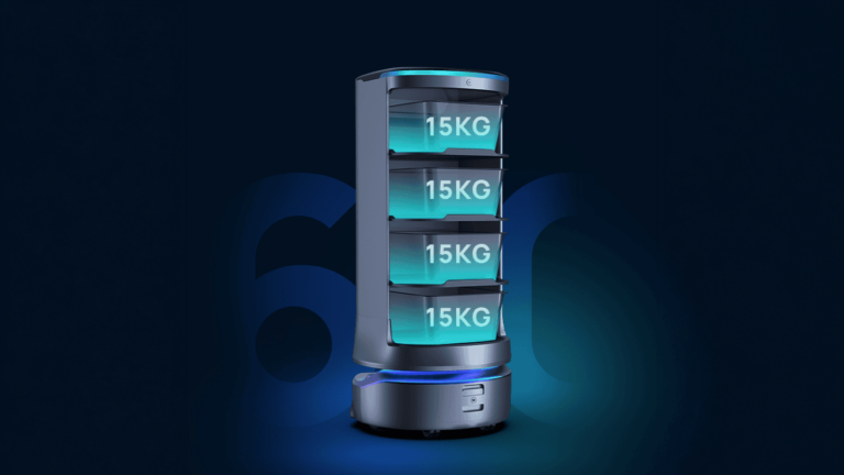 Der HolaBot kann bis zu 60 kg Gesamtgewicht mit einem Volumen von 120 Litern auf vier verstellbaren Trays bewegen.