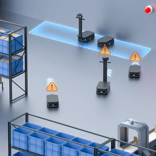 Ja, der Roboter verfügt über mehrere Sicherheitsebenen, Not-Stop-Funktionen und eine zuverlässige Hinderniserkennung, sodass er sicher in gemischten Arbeitsumgebungen fährt.